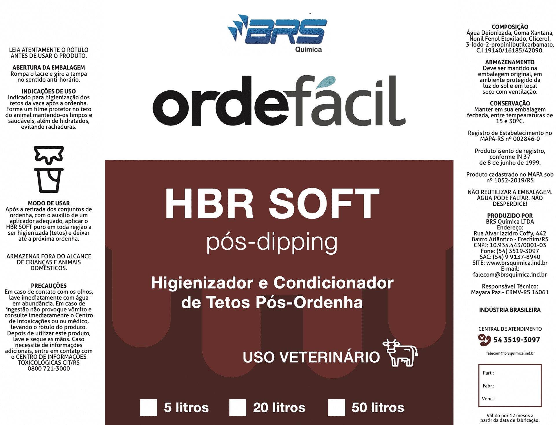 MODO DE USAR Após a retirada dos conjuntos de ordenha, com o auxilio de um aplicador adequado, aplicar o HBR SOFT puro em toda região a ser higienizada (tetos) e deixar até a próxima ordenha.