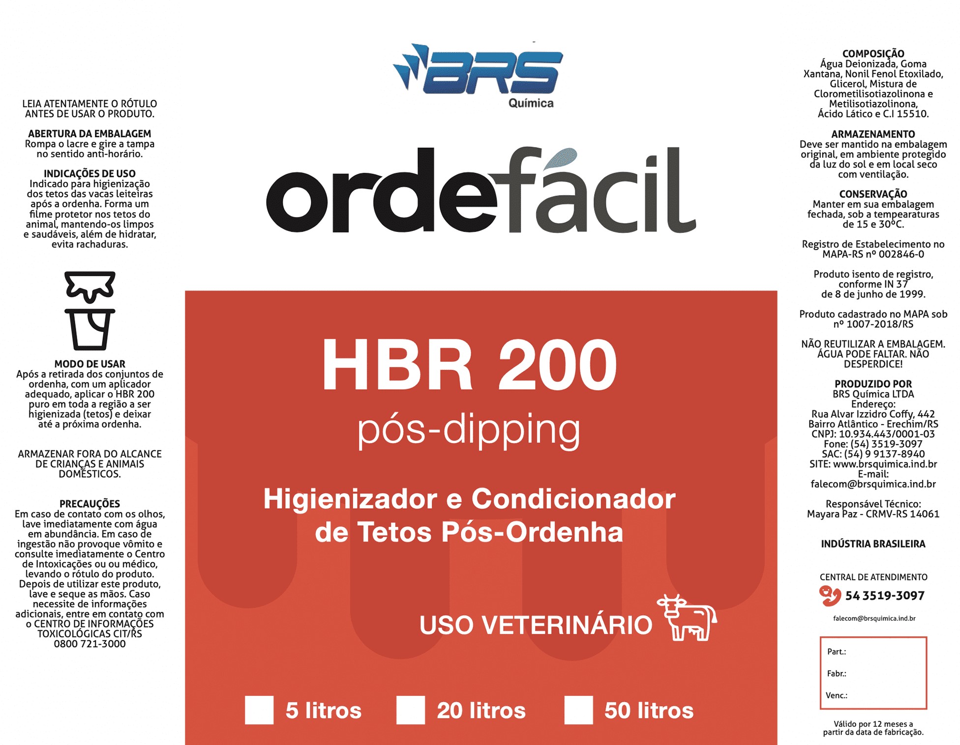 MODO DE USAR Após a retirada dos conjuntos de ordenha, com um aplicador adequado, aplicar o HBR 200 puro em toda a região a ser higienizada (tetos) e deixar até a próxima ordenha.