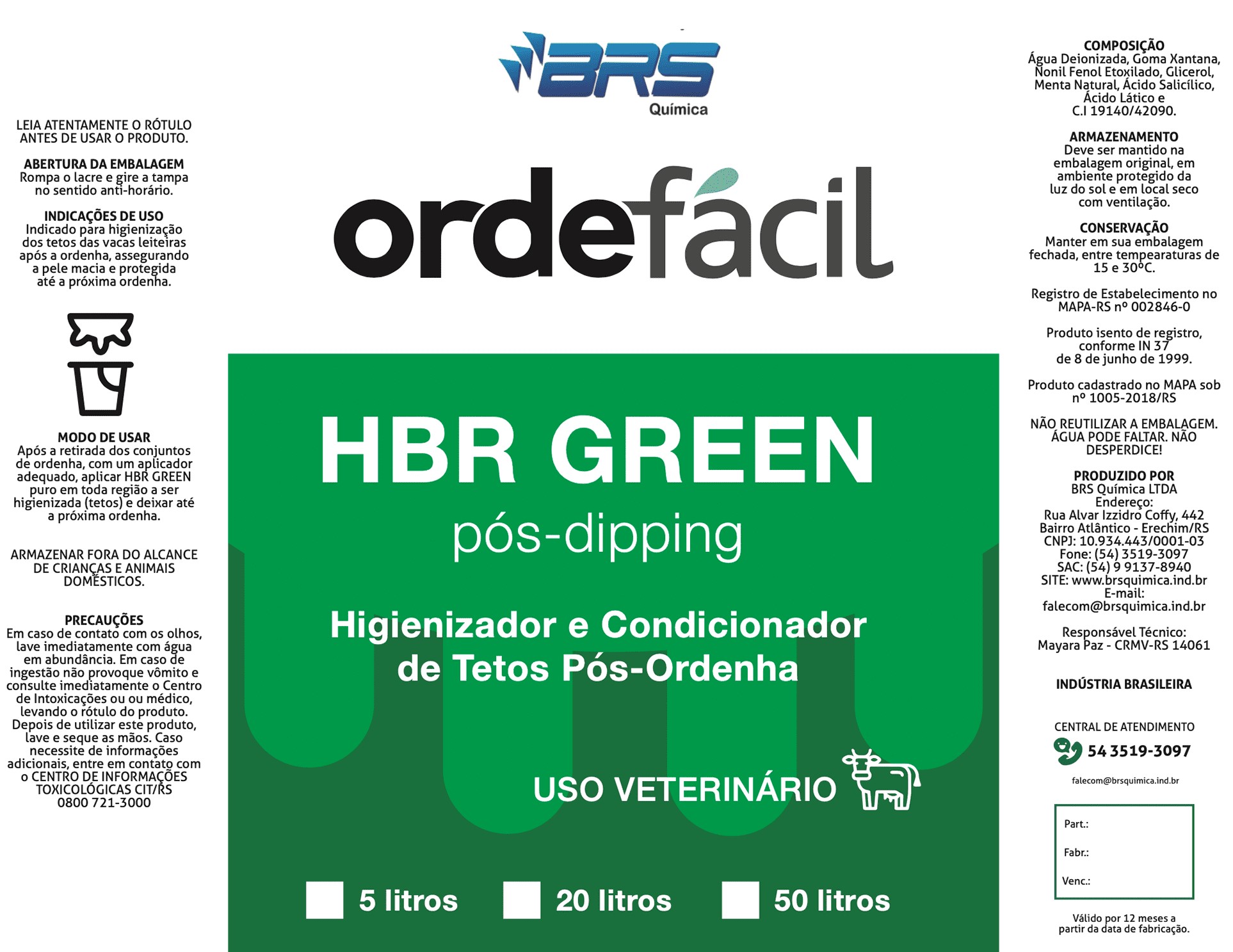 MODO DE USAR Após a retirada dos conjuntos de ordenha, com um aplicador adequado, aplicar HBR GREEN puro em toda região a ser higienizada (tetos) e deixar até a próxima ordenha.
