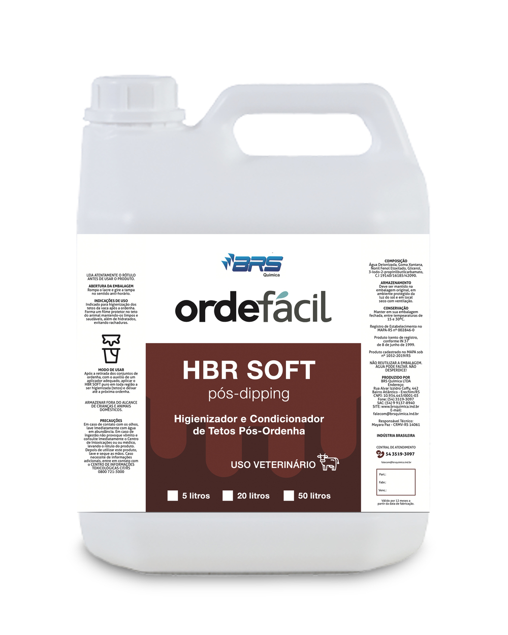 MODO DE USAR Após a retirada dos conjuntos de ordenha, com o auxilio de um aplicador adequado, aplicar o HBR SOFT puro em toda região a ser higienizada (tetos) e deixar até a próxima ordenha.